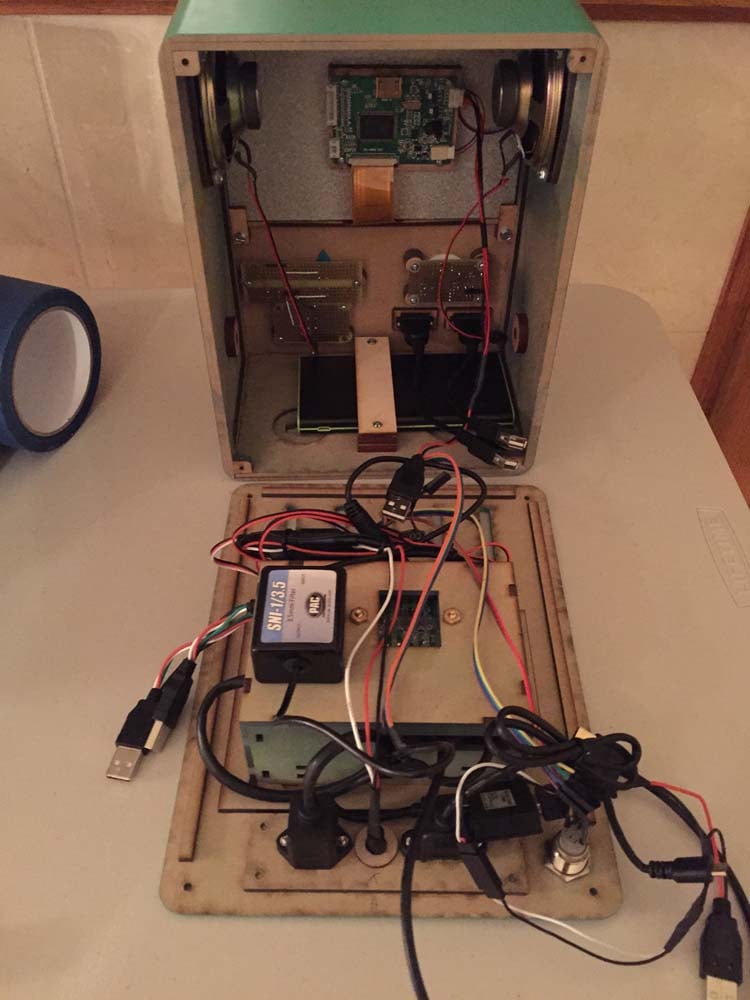 Most of BMO’s personality comes from custom animations that my daughter created and that were then turned into MP4 video files. The animations are triggered by the remote keyboard. Some versions of BMO have an internal microphone, and the Google Voice API is used to translate the user’s voice and map it to an appropriate response, so it’s possible to have a conversation with BMO.