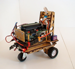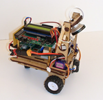 Both devices are interconnected by two small boards—one attaches to the RPi and the other to the Dwengo board—that are joined by a right angle header connection. The first does with some resistors the logic level converting (the Dwengo board runs on 5V), the latter board also has two DC jacks with diodes in parallel for power input to the RPi. To regulate the power to the Pi, I used a Turnigy UBEC that delivers a stable 5.25V and feeds it into the Pi by the micro USB connector. This gives a bit more protection to the sensitive Pi. As the camera image was a bit distorted I added a 470uF capacitor to smooth things out. This helped. Even though the whole Pi got hot, the UBEC stayed cold. The power input was between 600 and 700mA at around 8.2 volts.