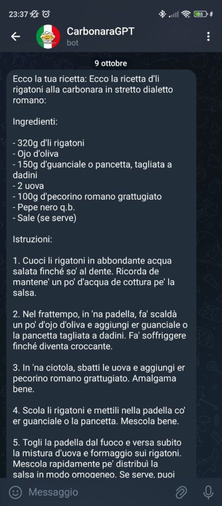 “As a cook, CarbonaraGPT is not great, but still better than those who put cream in carbonara.” Michele admits. “The AI gets confused and believes she’s authorised to add typical Roman ingredients to any dish, just because you asked her to speak in [the] Roman dialect.”