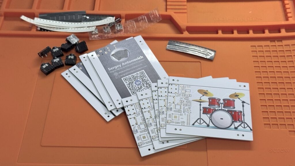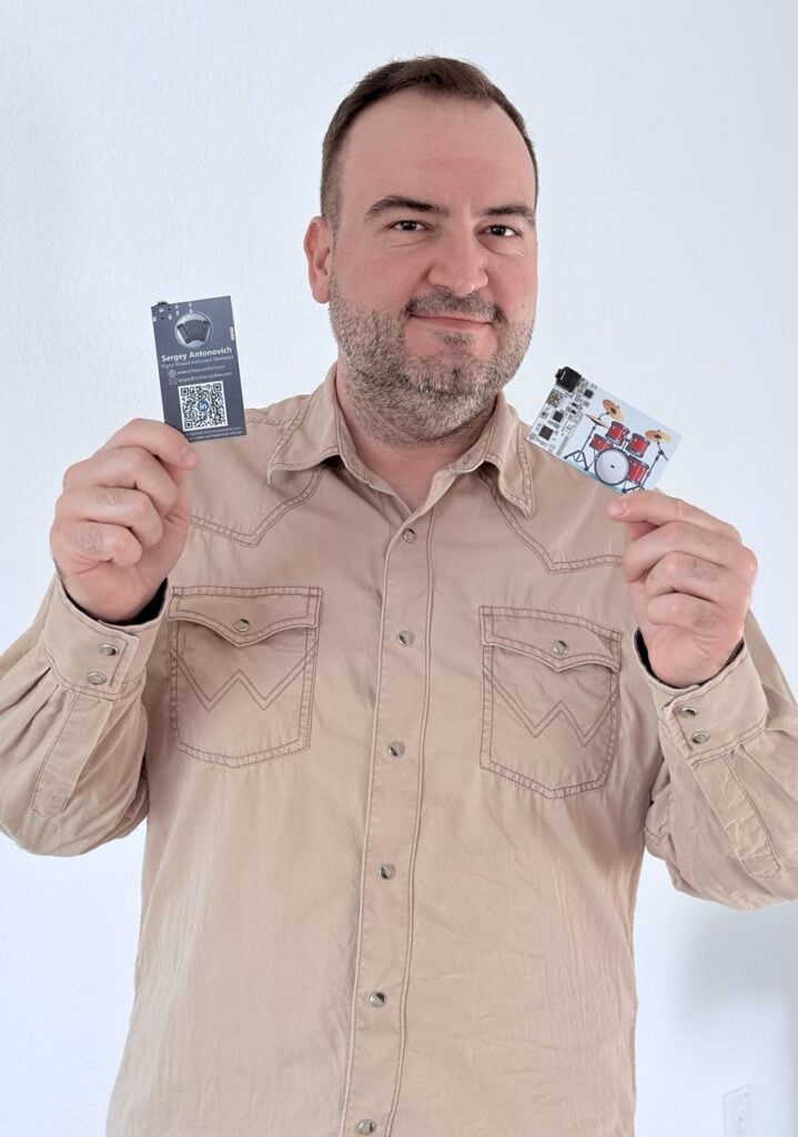 Sergey got the idea for the project some months ago. He enjoys building digital musical instruments — including ultra-portable, all-in-one digital accordions — and he was inspired by business cards that can fit an entire Linux system on a tiny PCB. Producing a business card that could be played felt like a natural fit. “It does three jobs at once,” he says. “It instantly grabs attention when you hand it over, it communicates exactly what I do, and it invites people to learn by reproducing the design.”