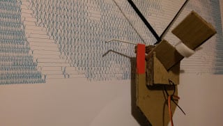 Suspended in-between the two motors is a print head, made out of a new 3-d modelling material I’ve been prototyping called cardboard. An old coat hanger and some velcro were also used.