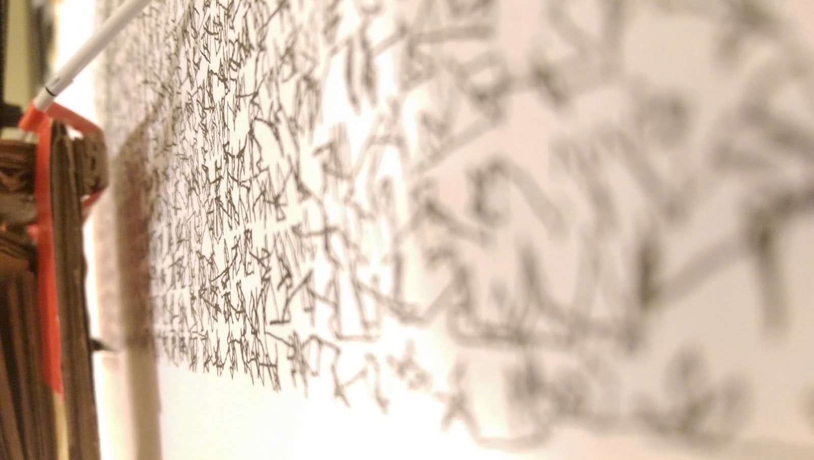 The pen point is guided around the image, but moves to each new point entirely at random. Up close this looks like a chaotic squiggle, but from a distance of a couple of meters, the human eye (and brain) make order from the chaos and view an infinite number of shades and a smoother, less mechanical image.