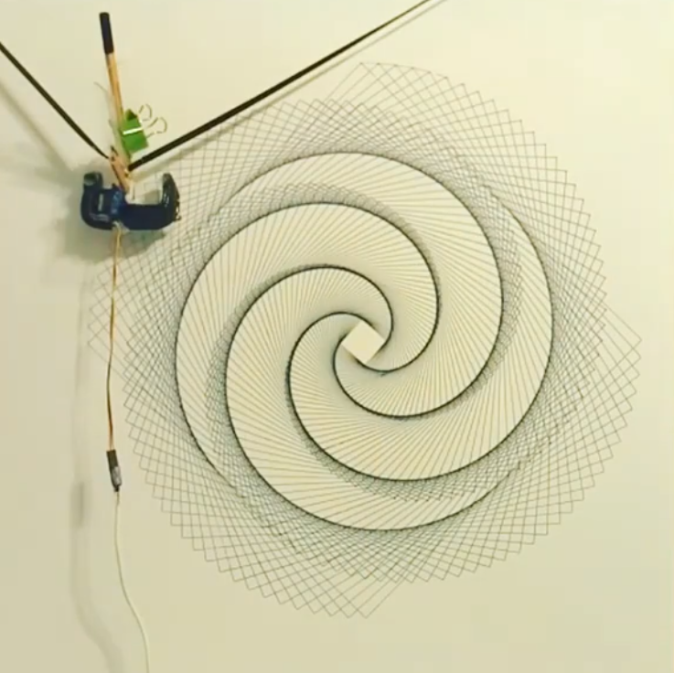 A hanging plotter, also known as a polar plotter or polargraph, is a machine for drawing images on a vertical surface. It does so by using motors to control the length of two cords that form a V shape, supporting a pen where they meet. We’ve featured one on this blog before: Norbert “HomoFaciens” Heinz’s video is a wonderfully clear introduction to how a polargraph works and what you have to consider when you’re putting one together.