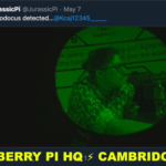 “…pressing a button at the back of the head unit makes the Raspberry Pi search Twitter for mentions of @JurassicPi. The LEDs light up green while it searches, just like you remember from the film. If Estefannie’s script finds a mention, the LEDs flash white and the Raspberry Pi camera module takes a photo. Then they light up blue while the script tweets the photo”.