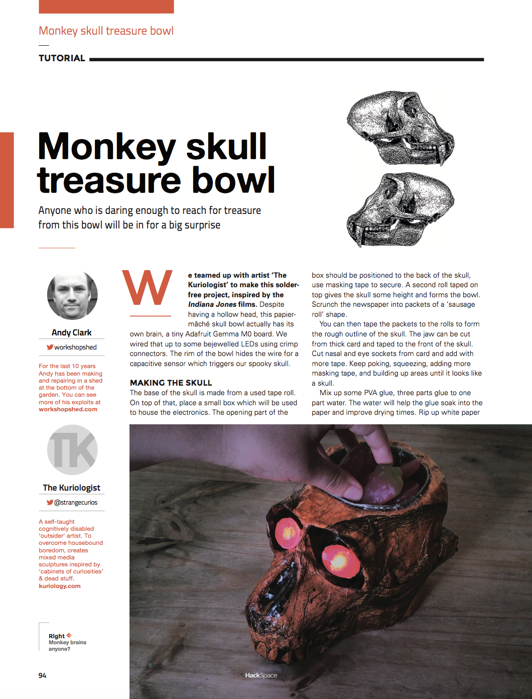 As always, the new issue is packed with projects: make a way-home machine to let your family know exactly when you’ll walk through the front door; build an Alexa-powered wheel of fortune to remove the burden of making your own decisions; and pay homage to Indiana Jones and the chilled monkey brains in Temple of Doom with a capacitive touch haunted monkey skull (no monkeys were harmed in the making of this issue). All that, plus steampunk lighting, LEDs, drills, the world’s biggest selfie machine, and more, just for you. So go forth and make something!