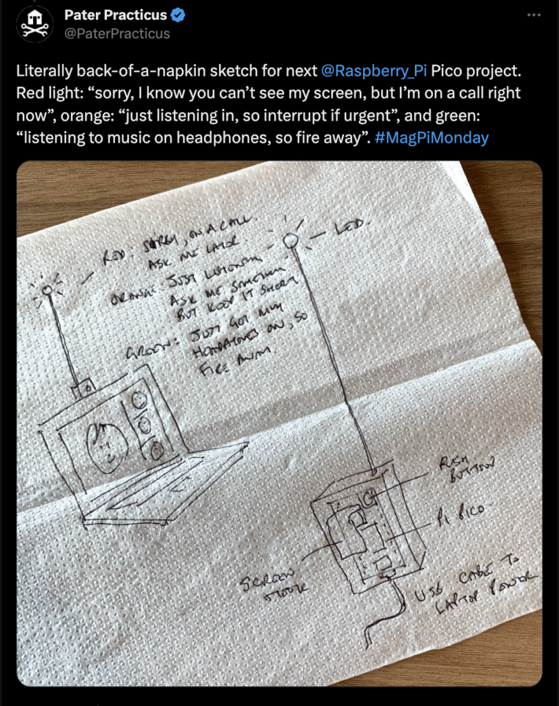 - Napkin drawing of the thing you’d love to build, but you need some cheering on first