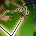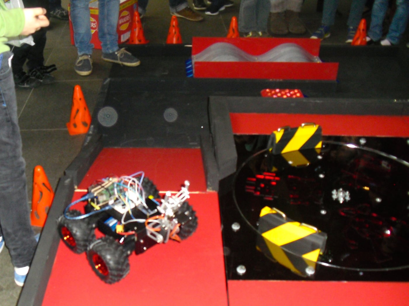 There were seven different challenges: Obstacle course, Skittles, Pi Noon – the Robot vs Robot duel, Straight-line speed test, Three-point turn, Line follower course and Proximity alert. [Liz: There’s an in-depth look at the turntable element of the obstacle course at PiBorg’s website.]