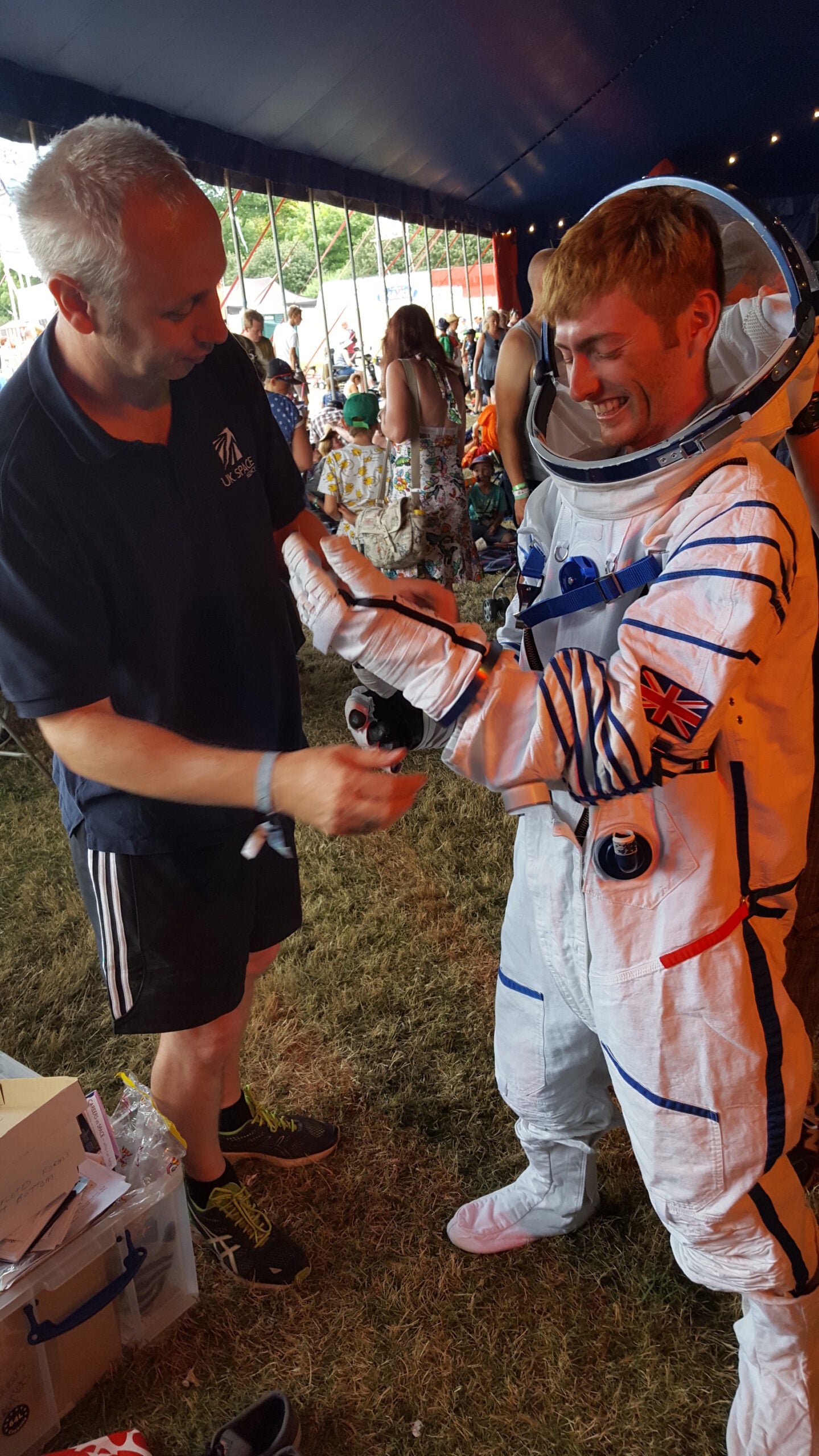 We visited our friends at the UK Space Agency in the Mission Control tent, and they kindly lent us one of their spacesuits to go with our Astro Pi activities. Dan certainly looked the part in it.
