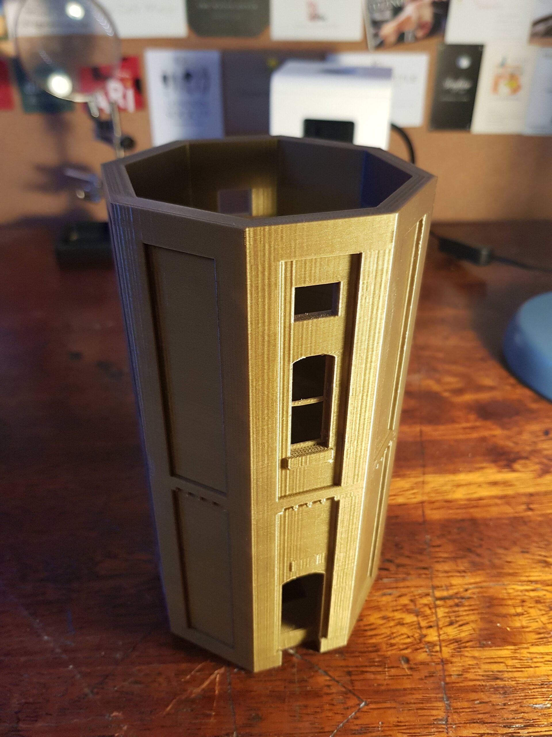 Dave designed the 3D model in Autodesk 123D, with a plethora of photographs of the lighthouse as reference points. And many hours later, he began 3D printing ten lighthouse shells using his Prusa MK2.5.
