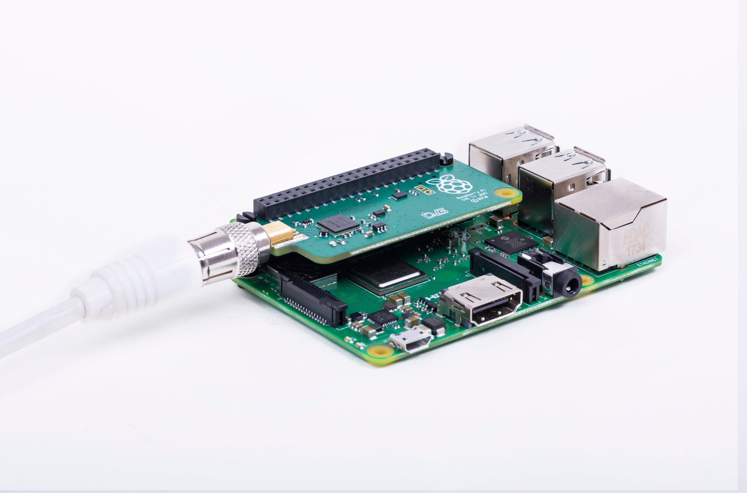 The TV HAT connects to the 40-pin GPIO header and to a suitable antenna, allowing your Raspberry Pi to receive DVB-T2 television broadcasts.