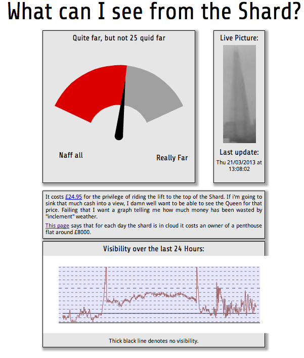 But Willem has realised that his rage can be assuaged with a little dose of sour grapes, and that information is beautiful even if the Shard isn’t, so he’s hooked a Raspberry Pi up to a camera pointing at the thing to remind himself that life at the top of the Shard isn’t always a light-bathed soak in other people’s views.