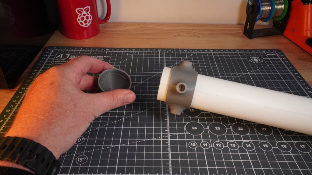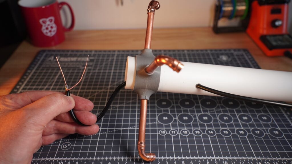 Toby set to work making a suitable antenna from a combination of plumbing materials in the form of copper and plastic piping, some 3D-printed parts, a Raspberry Pi 4 model B and a cheap USB Software Defined Radio (SDR). Keen readers will notice that this is the exact same low-cost SDR Toby used previously to build our own Raspberry Pi flight tracker.