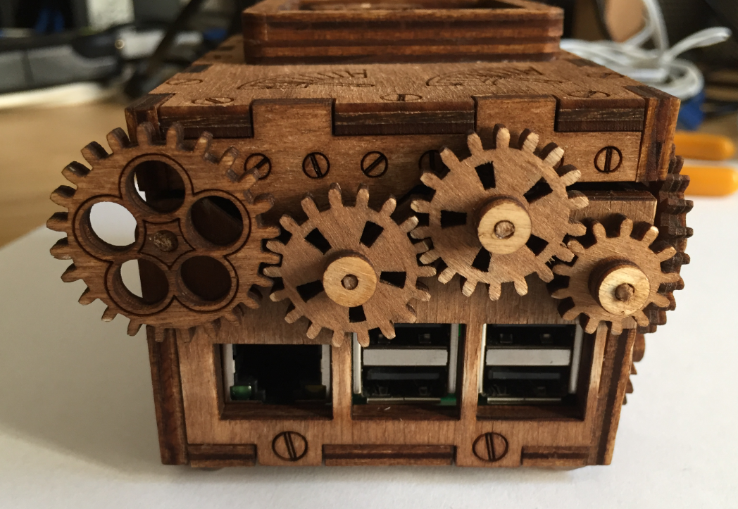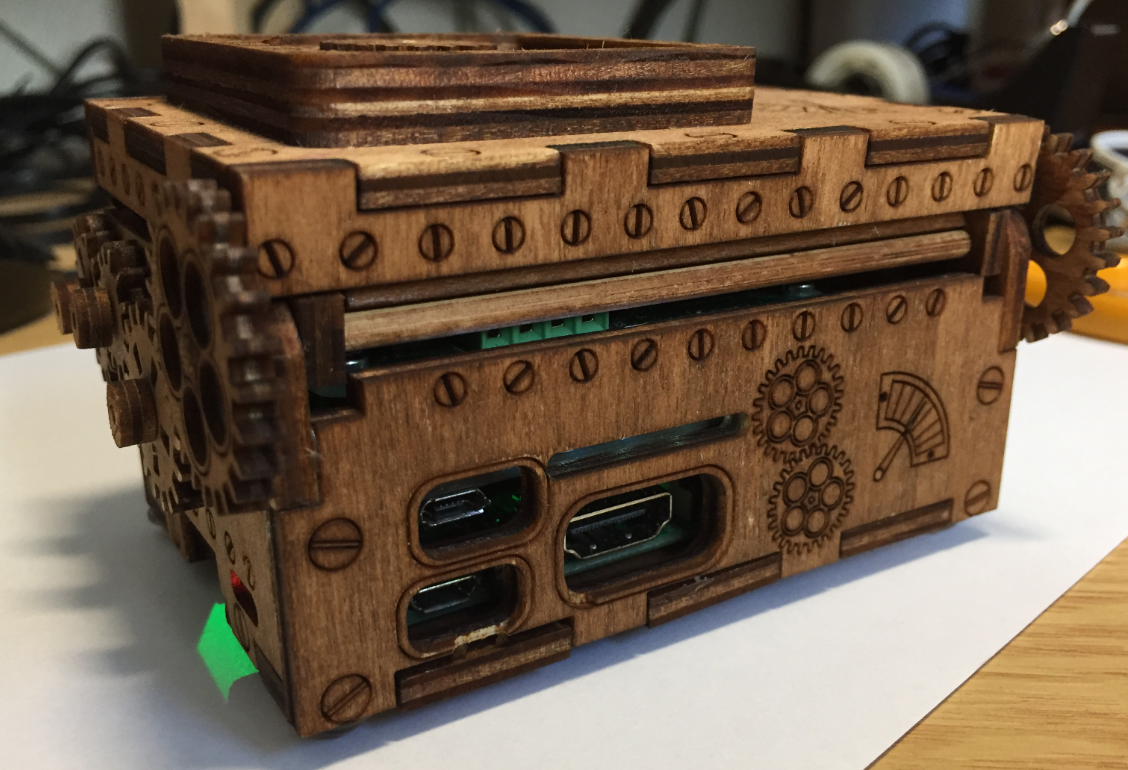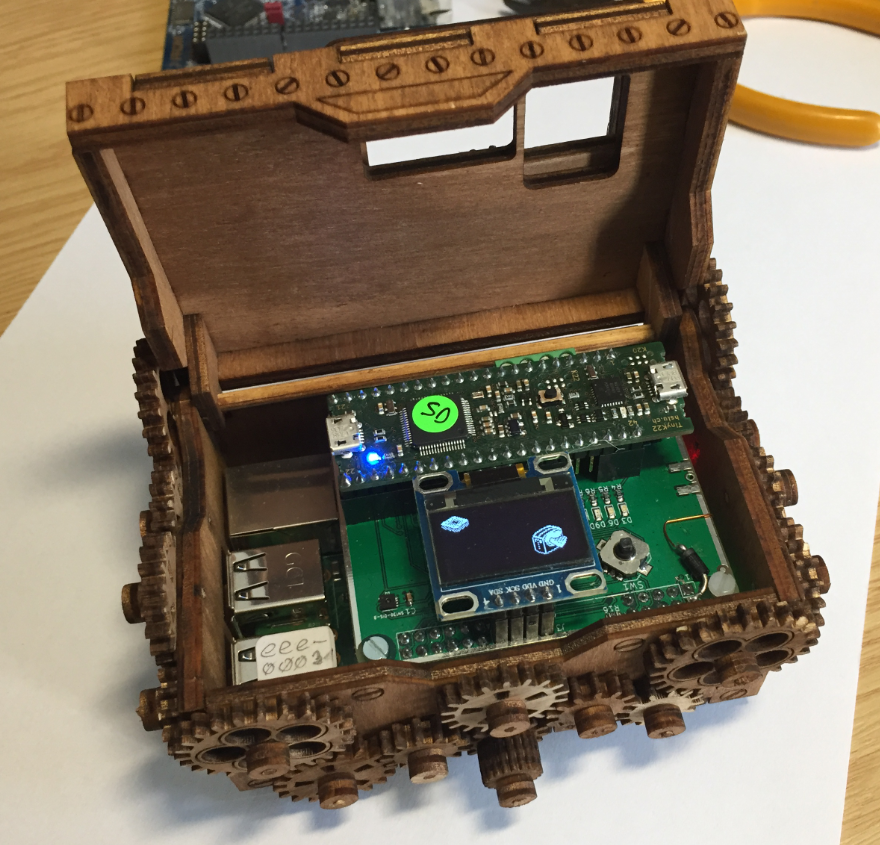 This steampunk enclosure for the Raspberry Pi by Erich Styger was laser-cut out of 4 mm birch plywood, and stained to make it look a bit more 1890s. It’s built to fit a Raspberry Pi with an NXP tinyK22 board and a battery backup, and there are ports artfully crafted into it so that the system is fully functional even when the box is closed.